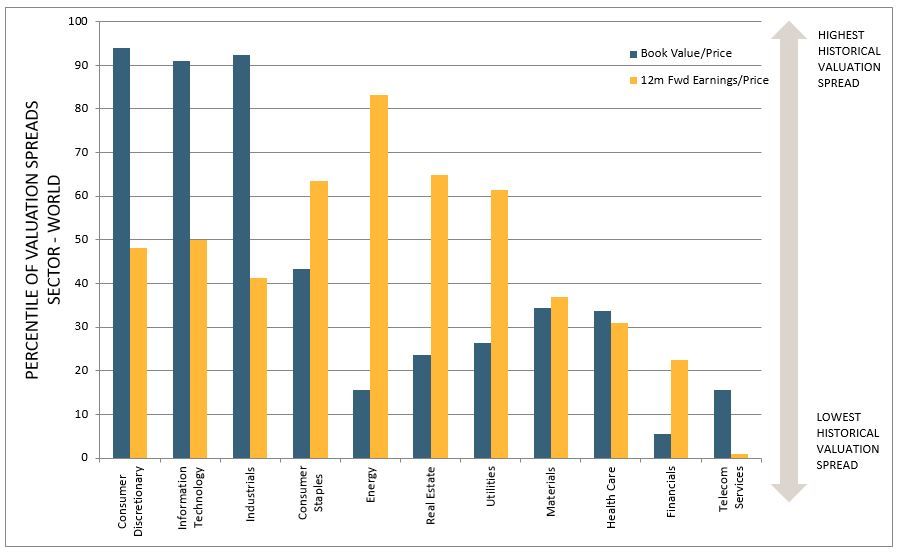 In emerging markets, consumer staples and consumer discretionary were the most "expensive" sectors while financials and real estate were the "cheapest" in terms of valuation.