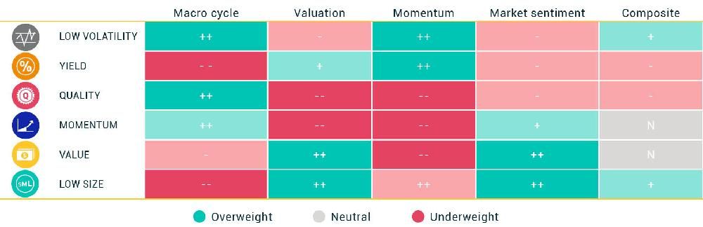 Data as of June 28, 2019. Note: Indicators highlight overweight and underweight index positions relative to an equal-weight six-factor index mix. "++" denotes a strong overweight, "+" a mild overweight, "N" neutral, "-" mild underweight, "--" strong underweight.