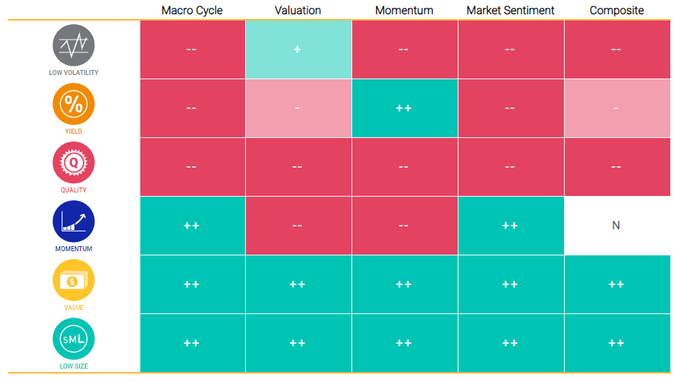 - The momentum pillar selected value, yield and low size, based on the last three months' relative performance.
