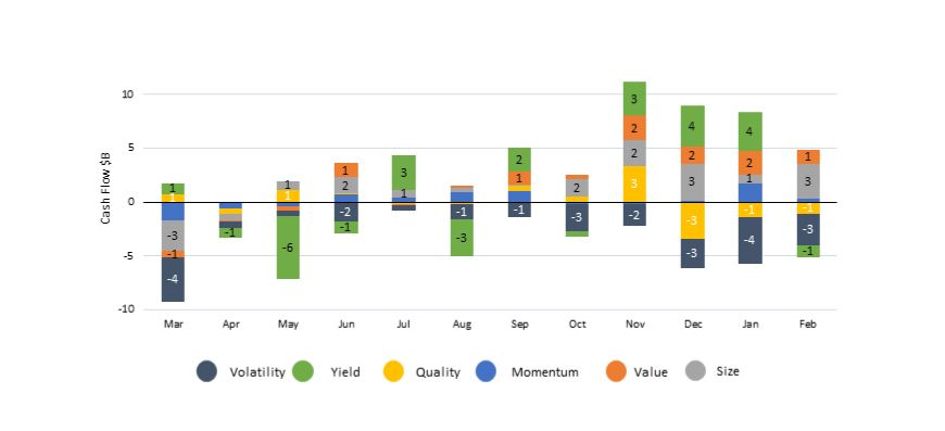 The exhibit below shows the USD flows of globally listed ETFs from March 2020 to February 2021. Most recently, a clear trend emerges whereby value, yield and size ETFs — linked to the top-three performing factors during economic recovery — saw the biggest inflows since November last year, with a total of USD 27 billion flowing into these factor ETFs in the four months through February 2021.