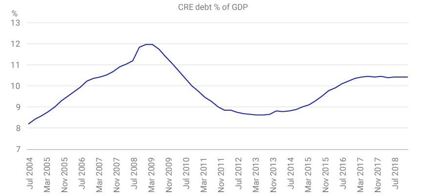 CRE debt is measured as the total value of outstanding CRE loans issued by U.S. commercial banks. Source: Federal Reserve Board