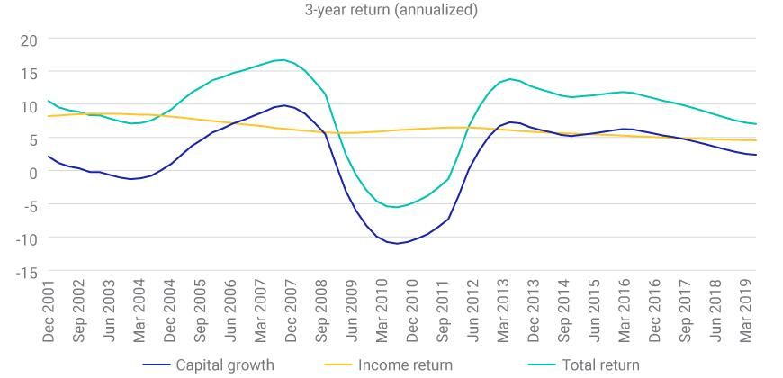 Total real estate return can be decomposed into capital growth and income. The exhibit below shows the strong cyclical pattern of total return, which was driven largely by the capital-growth component. Also, the subprime-mortgage-led credit boom and bust dominated CRE's total-return data from 2005 to 2011.