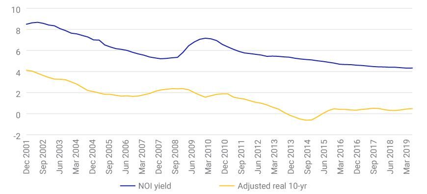 NOI yield has closely followed the adjusted real rate of the 10-year Treasury