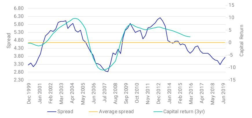 The exhibit below shows the overlay of the spread and the three-year capital return. The capital return for each calendar date represents the return for the subsequent three years. Historically, a tighter spread indicated weaker capital return for CRE — which in turn led to concerns about CRE valuation. Meanwhile, the current, more patient and dovish Fed could accommodate a smoother transition. We note that for a longer-term CRE investment horizon with less leverage, investors have historically been better able to ride through the credit cycle.