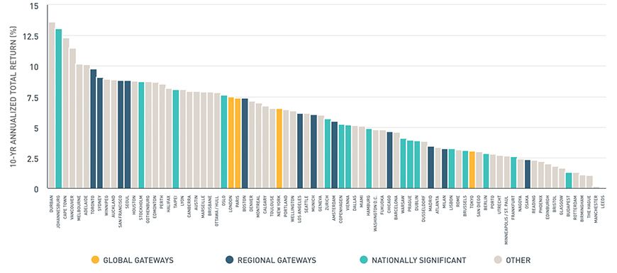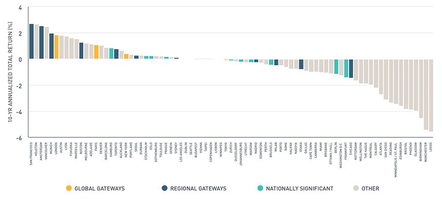 However, adjusting annualized total returns for country effects, Global Gateway City markets tended to outperform, clustering in the top half of the distribution in the exhibit below (left side).