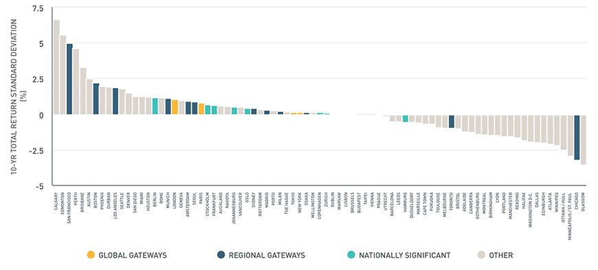 The exhibit below shows Global Gateway City markets recorded higher volatility (standard deviation) of yearly total return than their national market average, ranking them in the top half of the distribution.