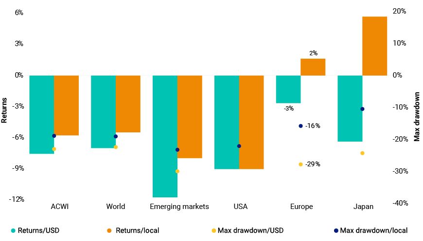 Data from Jan. 31, 2022, to Jan. 31, 2023. Gross returns in USD and local currency. Right plot: Blue — MSCI Europe Index (developed-market) countries. Red — MSCI Emerging Markets Europe Index countries. Turkey is an outlier (with >100% returns) and not shown in the plot. Max drawdown is the maximum loss, based on daily returns, from peak to trough over the period shown. For market-illustrative purposes during this period only and may not represent long-term index performance.