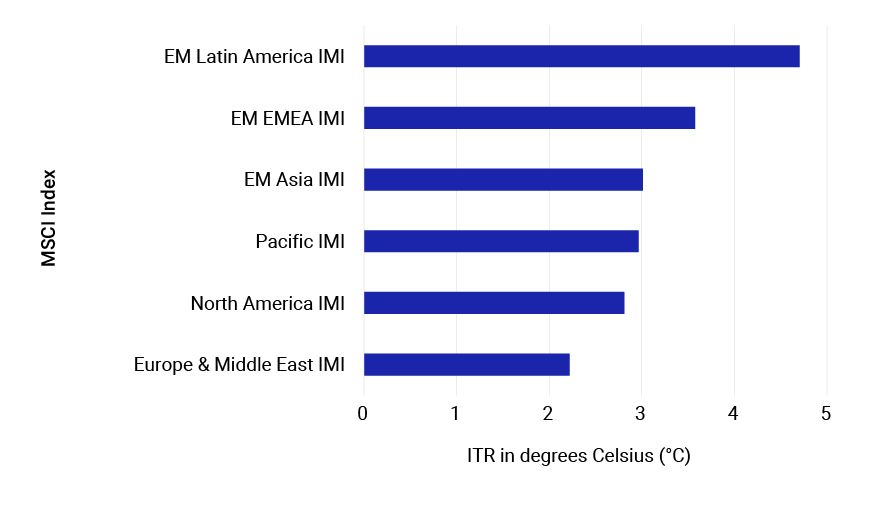 The chart shows the ITR average weighted by market capitalization of the constituents of the mentioned MSCI indexes as of Feb. 8, 2023. IMI stands for Investable Market Index and EM stands for emerging markets. Source: MSCI ESG Research