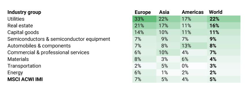 The data represents a simple average of the most recently disclosed annual green revenues for the constituents of the MSCI ACWI IMI, as of Feb. 9, 2023, for seven Global Industry Classification Standard (GICS®) industry groups with the largest share of green revenues globally, plus transportation and energy. The data represents the combined share of all company revenues derived from any of the six environmental-impact themes, including alternative energy, energy efficiency, green building, pollution prevention, sustainable water and sustainable agriculture. For more information, see: "MSCI Sustainable Impact Metrics Methodology," August 2021. GICS is the industry-classification standard jointly developed by MSCI and S&P Global Market Intelligence. Source: MSCI ESG Research, company filings