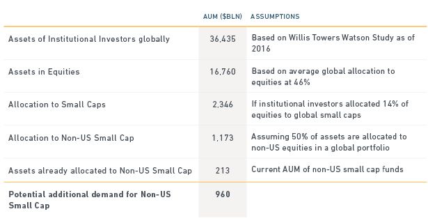 First, we tried to calculate the potential demand based on a 14% equity allocation to global small cap. Based on $36.4 trillion in total pension assets, we find that their global small-cap allocation would have been $2.346 trillion at year-end 2016 (see our assumptions in the below table). Pension funds would have allocated about half of that figure — or $1.173 trillion to non-U.S. small cap funds. From that figure, we net out $213 billion that pension funds have already invested in active non-U.S. small cap funds. The resulting net demand is $960 billion.