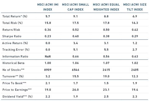 There are two key ways to bridge the gap: Asset managers can launch more active funds or pension funds can use indexed vehicles that aim to replicate available indexes such as MSCI's suite of global small-cap indexes. Our previous research shows that replicating such indexes have offered effective and investable ways of obtaining exposure to the size premium. Over the past 20 years, these indexes have produced excess returns over MSCI ACWI IMI, with superior risk/reward and Sharpe ratios. Characteristics of these indexes can be seen below.