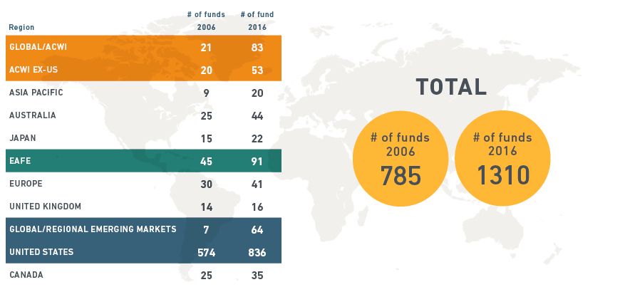 In the decade from 2006 to 2016, there was striking growth in the number of institutional small-cap funds available globally, according to the Evestment database. However, it is clear that U.S. small-cap funds still dominate the global landscape, accounting for nearly two-thirds of total institutional small-cap funds.