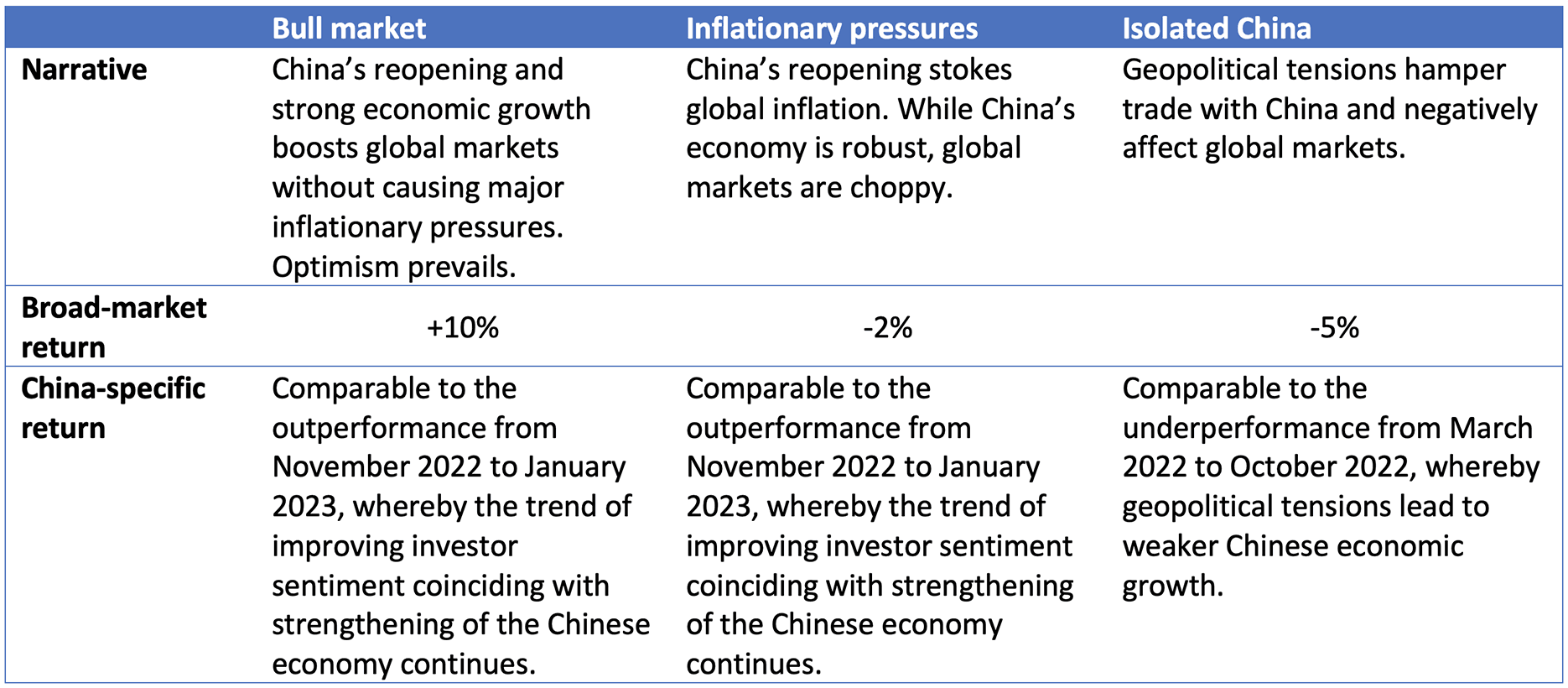 This framework assumes there is no additional impact on a stock's return beyond the broad market and exposure to China. Hence, it does not aim to predict stock returns accurately, but could serve as a data point for investors to weigh the trade-off between broad-market risk and exposure to a specific theme under various scenarios. For an illustration, we assess three hypothetical scenarios for the broad global market and China.