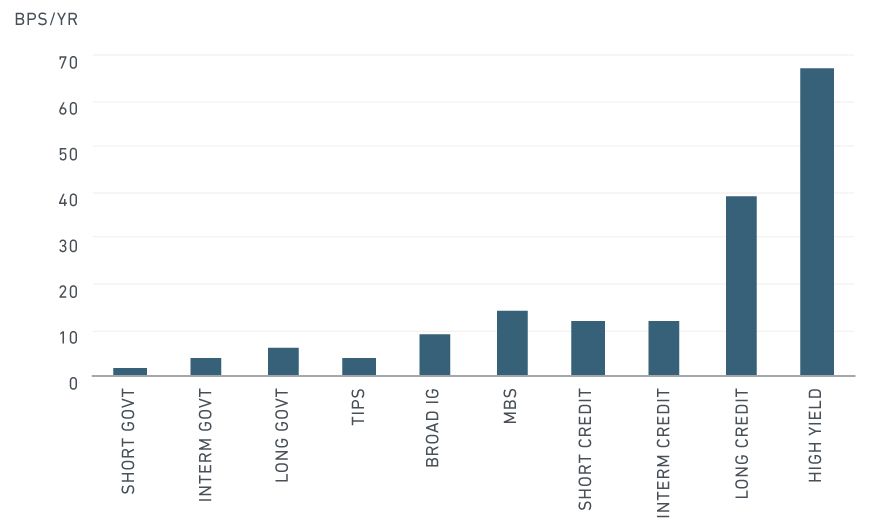 We found that ETFs invested in the government (non-mortgage-backed securities) sectors consistently tracked benchmark performance very closely, with median annual tracking error ranging from 1 to 6 basis points (bps). Tracking error on MBS, broad investment-grade and the short and intermediate credit sectors was modestly higher (ranging from 9 bps to 14 bps) than the government sectors. At 67 bps, the high-yield sector had the highest tracking error, while the long investment-grade credit sector experienced tracking error of 39 bps.