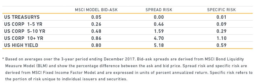 Over the next several years, growth in e-trading and regulatory initiatives including MiFID II3 may result in greater price transparency in the fixed-income market. This, in turn, could lead to improved index pricing and stronger portfolio construction tools based on better market liquidity modeling. Particularly for the less liquid parts of the bond market, these developments may help reduce tracking error and may provide investors with a better understanding of sector risk and reward tradeoffs.