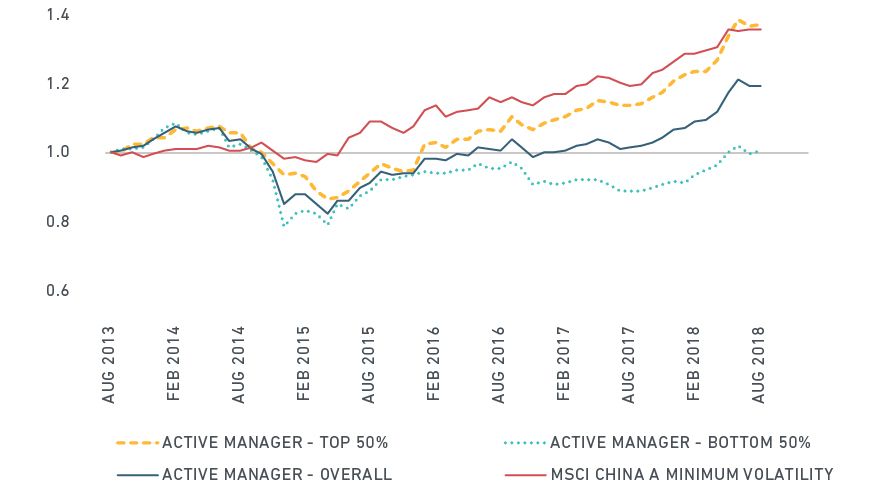 Source: Lipper, MSCI Research. From the Lipper database, we selected active equity funds with a focus on the China A market and at least a 5-year track record as of Aug. 31, 2018: 29 funds were identified. Aggregate portfolios of active managers were then asset weighted and rebalanced monthly.