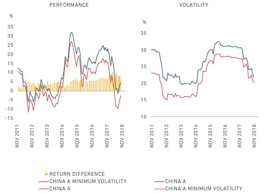 Rolling three-year performance and volatility of MSCI China A Minimum Volatility Index