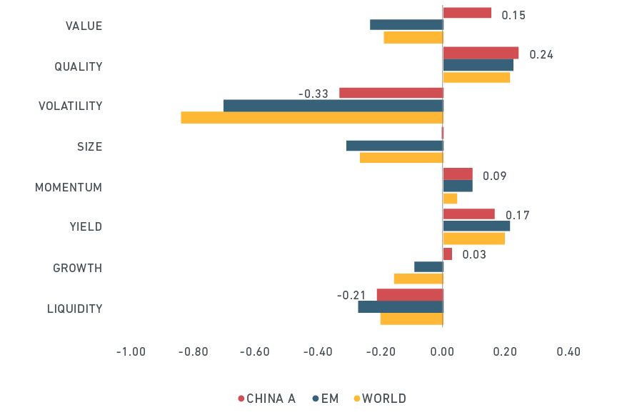 - On average, the MSCI China A Minimum Volatility Index historically has been tilted towards stocks featuring cheaper valuation, higher dividend yield and stronger fundamental quality (see exhibit below). These factor characteristics contributed to the outperformance during our sample period.6