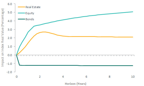 The MSCI Macroeconomic Model provides another perspective, with similar conclusions, by looking at how real estate is expected to respond to a sudden boost in economic growth. Real estate, like equity, benefits from the unlimited upside of greater cash flows associated with higher economic growth, while bonds suffer due to the negative impacts of higher discount and inflation rates. This sensitivity of real estate performance to growth makes it a significant source of systematic risk, rather than the diversification source assumed in many asset allocation decisions.