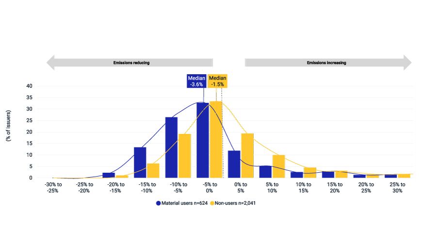 Distribution of annualized change in company-reported gross Scope 1 and 2 emissions for material credit users and non-users, 2017-2022