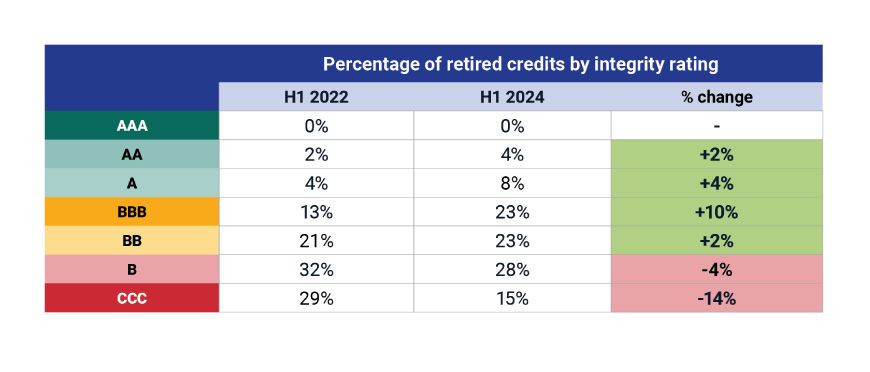 Proportion of retired credits by integrity rating, 1H22 compared with 1H24