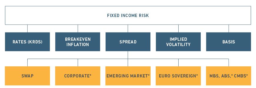 Fixed-income risk is decomposed among various classes of factors. The spread factors denoted (*) use duration times spread (DTS) exposures. Currency, equity, commodity and private asset factors are also modeled but not shown here.