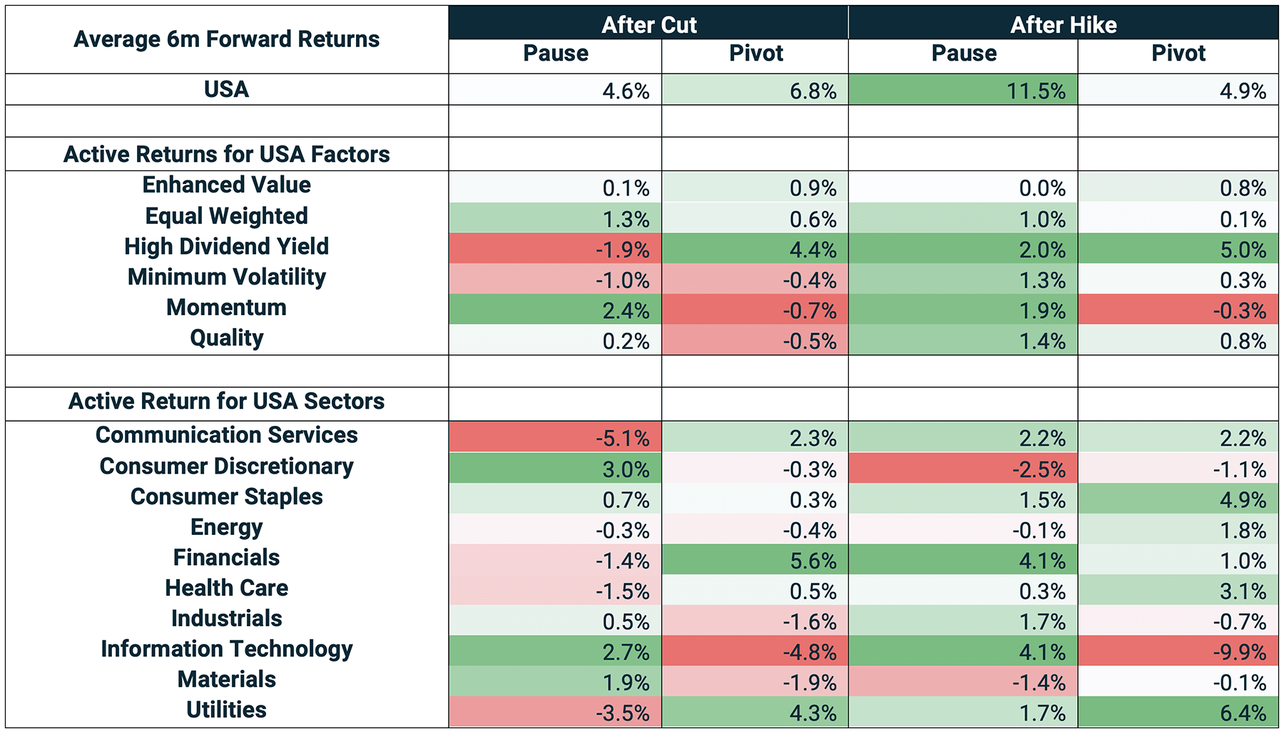 Regardless of when it comes, the possibility that the U.S. rate-hike cycle might be coming to an end may have implications on the broader equity market, as well as on individual factors and sectors. With that in mind, we analyzed historical data to check how the MSCI USA factor and sector indexes have responded to such a change six months after the last hike or cut, depending on whether the Fed kept rates steady or reversed direction over that six-month period.