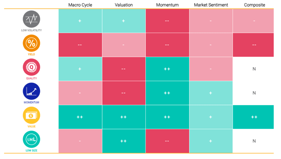 Our adaptive multi-factor framework is a model designed to analyze factor-based decisions. Our research suggests the value in taking a holistic approach to factor assessment. This approach encompasses not only the macroeconomic environment as shown above, but factor valuations, recent performance trends and risk sentiment.