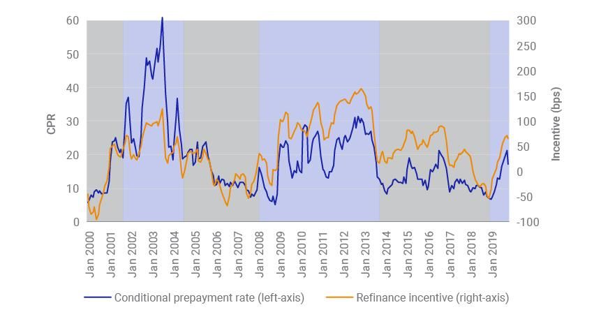 - 2019: The gap between the prepayment and incentive lines narrowed meaningfully, indicating higher refinancing efficiency.
