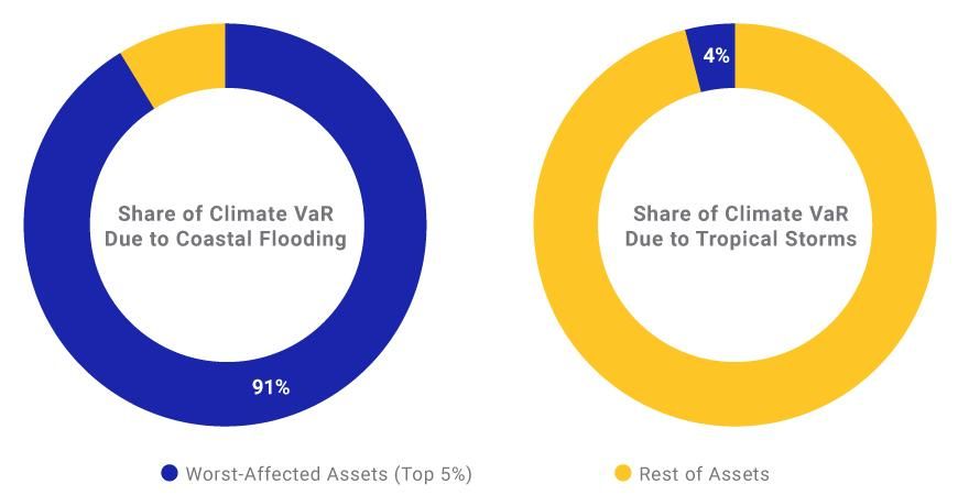 Another distinction was how the different physical risks were distributed across the asset sample. For coastal flooding, we observed that only a handful of assets with the highest exposure were responsible for nearly all (91%) of the estimated Climate VaR. By contrast, the Climate VaR caused by exposure to tropical storms was more evenly distributed across the sample, as illustrated in the chart below.