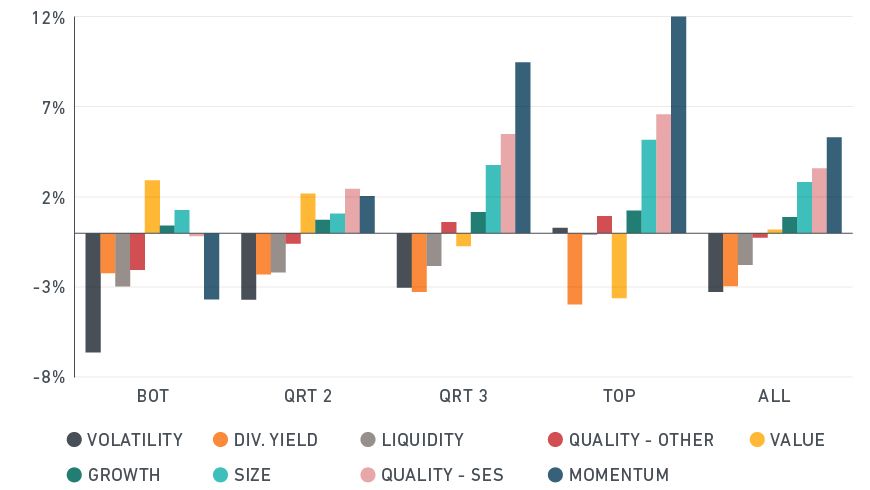 Among factor groups, exposure to style factors (in yellow) was the largest contributor, accounting for 19% of total active return. Within style factors, Systematic Equity Strategies (SES) — rules-based strategies that have generated excess returns over long time periods — explained 54% of contributions. When we peel the performance onion further, we find that Price Momentum, Residual Volatility, Beta, Dividend Yield and Profitability were the most significant individual factors.