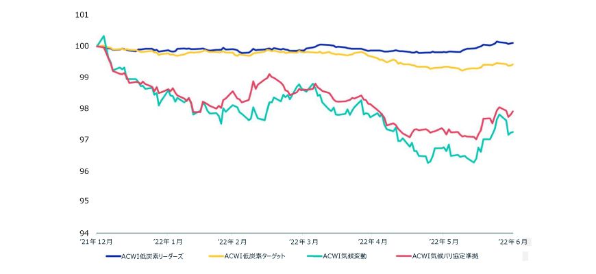 各種MSCI気候指数のMSCI ACWI指数比での相対的なパフォーマンス(2021年12月31日~2022年6月30日)。
