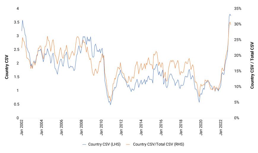 - The dispersion of emerging markets returns driven by country rose to historic highs in 2022, as deglobalization proceeded at an accelerated pace.
