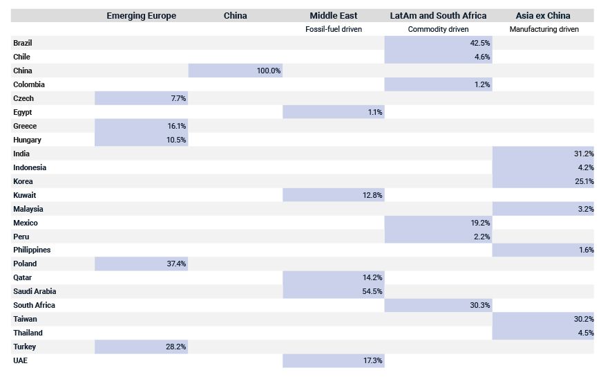 A potential reaction to this dispersion has been the consideration of distinct allocations to China and EM ex China.1 By separating China, the largest EM country, allocators are aiming to manage country risk by assembling a more diverse EM portfolio. EM ex China includes countries with diverse economic fundamentals, industrial structures and varied exposures to market and geopolitical risks. However, the segregation of China may not provide enough flexibility in allocation decisions or achieve greater diversification.