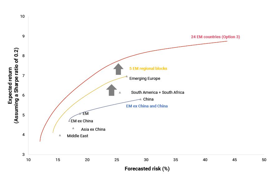 In comparison, option two provides a middle ground. Under our assumptions, for the same expected return as the EM index, the forecast risk could be reduced from 18.8% to 16.1% at a cost of only a mild increase in decision making complexity. The practical implication is that using blocks of similar countries can help allocators gain diversification benefits and create more allocation opportunities, while limiting the decision-making complexity.