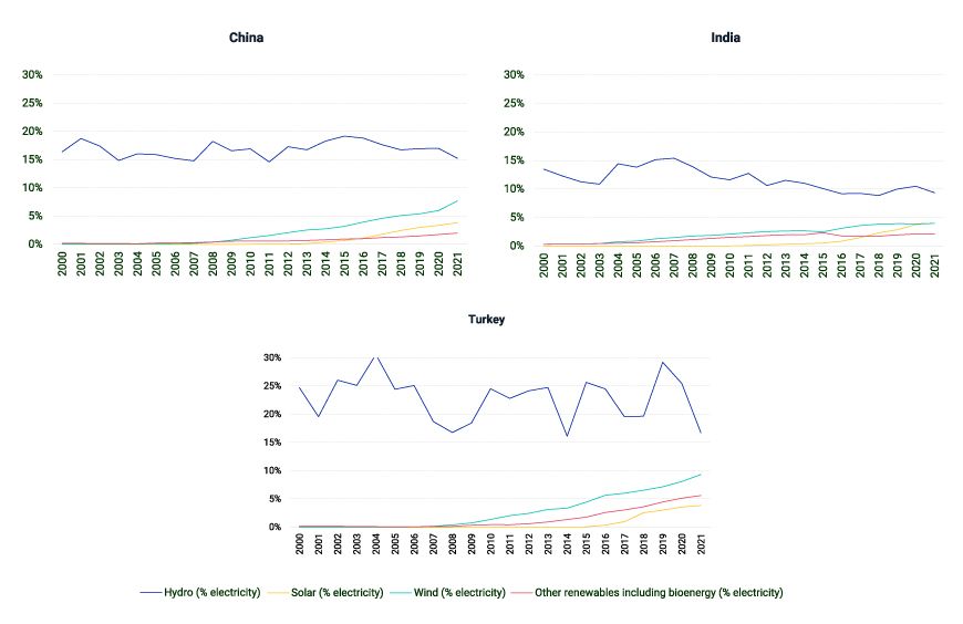 This is illustrated by looking at the electricity mix of China, India and Turkey. Hydro power represented over 10% of the electricity mix in all three markets since 2000, meaning it wouldn't be eligible on the common-practice basis. Wind would not, however, have passed the common-practice test in China until 2017, in Turkey until 2016 and still fails for India. Solar has never represented more than 5% of the electricity mix in any of these markets, but arguably is a widely investable technology type. Consequently, for these large developing economies, investment-return analysis is the more relevant test of additionality.