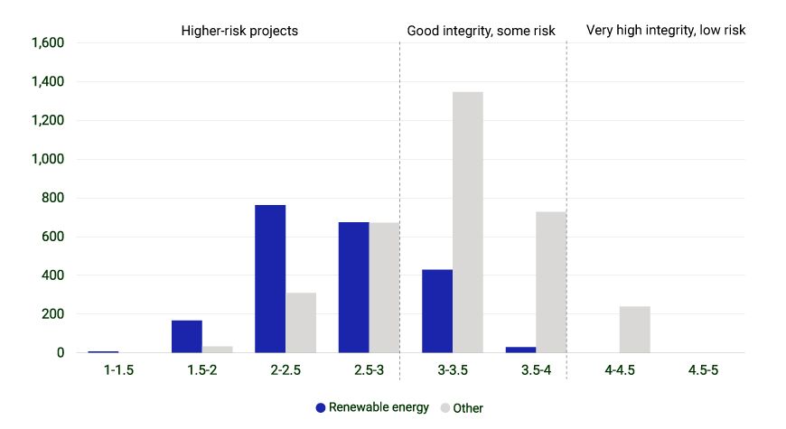 MSCI Carbon Markets assessed the integrity of more than 1,700 existing renewable-energy projects, scoring each out of five.[5] While they all undoubtedly have climate benefits, they can carry material risks from a credit-integrity perspective.