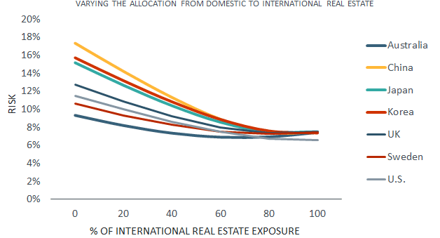 The implications of international diversification vary significantly across countries. Domestic real estate markets differ in their local risks and in their degree of correlation with other real estate markets. The potential impact of these differences can be seen in the chart below, which shows the stand-alone real estate risk for different countries at different levels of international exposure calculated using MSCI's PRE2 model in BarraOne. Under this model, the available diversification benefit is greatest for high volatility markets like China, but is also apparent for lower volatility markets like Sweden and Australia.