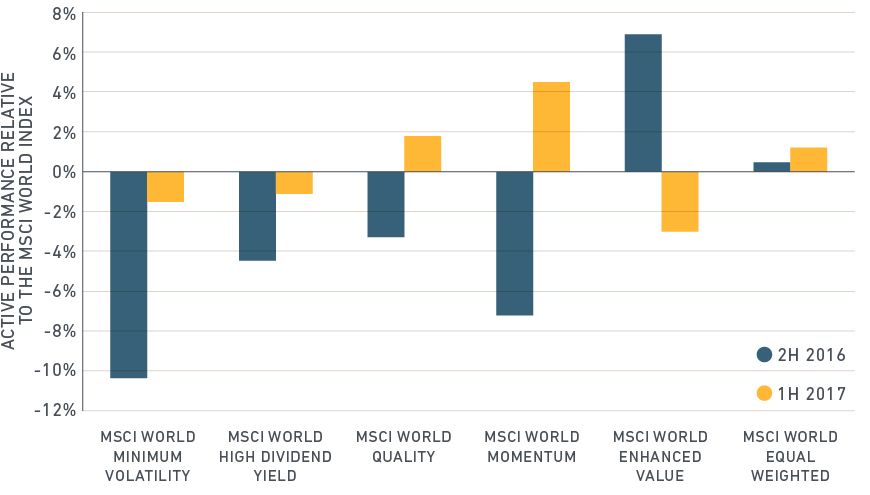 We have seen substantial rotation in factor index performance in the past 12 months. Value, the best-performing equity factor index in the second half of 2016, was the worst performer in the first six months of 2017. On the other hand, Quality, which had lagged last year, has performed well in 2017. But this has left quality stocks at peak valuations for the past decade, confronting investors with a question: Is it time to reduce exposure to this factor?