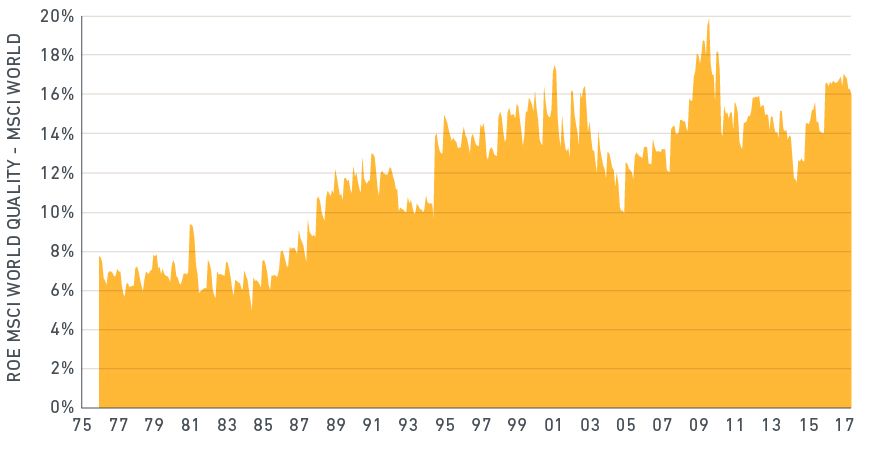 Arguably, the inflation of asset prices and collapse in market volatility prompted by central-bank policies have dampened the price-discovery process, so corporates with weaker fundamentals may have had (artificially) much lower volatility on an absolute and relative basis. This could be why investors have recently preferred companies that have stronger fundamentals. High profitability has been a key driver of MSCI World Quality Index outperformance. From a historical perspective, shown in the plot below, the ROE spread of the MSCI World Quality index versus its parent index is close to the highest levels spanning our dataset.