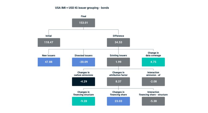 The bond sub-portfolio's carbon footprint increased less than the equity sub-portfolio's carbon footprint decreased. The increase of the bond sub-portfolio's carbon footprint was mostly due to the addition of issuers to the portfolio.8 The issuers consistently held in the portfolio also contributed to a small increase in carbon footprint, mostly driven by an increase of financing share that was more pronounced than the actual decarbonization at the issuer level.