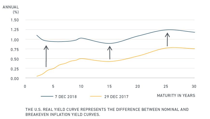 In 2018, yields have risen across the yield curve, with 2-year real yields up 107 basis points (bps) through Dec. 7 and 10-year real yields up 53 bps.