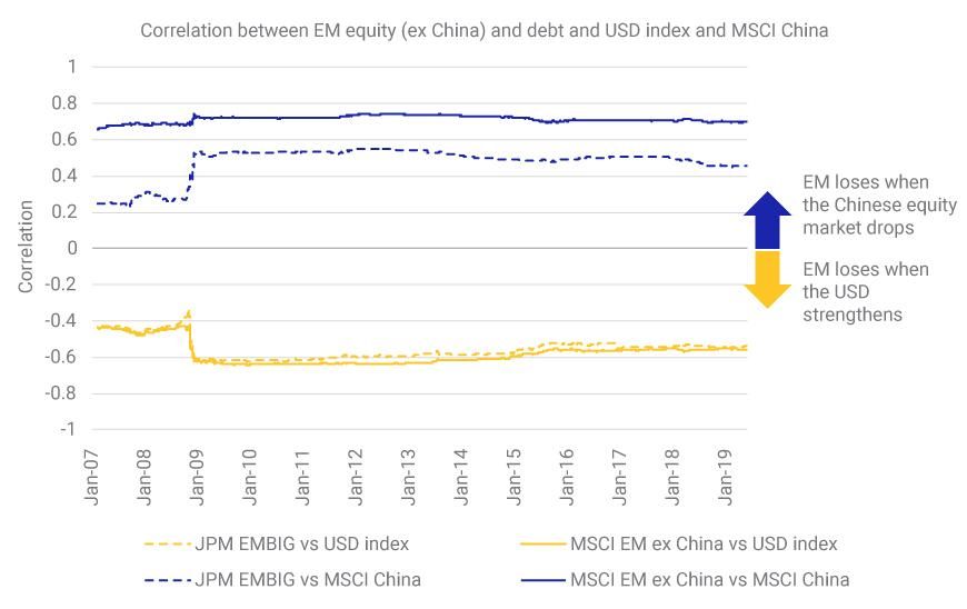 Correlation between EM debt and equity and the USD index and MSCI China Index. Correlations are estimated based on weekly overlapping returns using an exponentially weighted moving average with a three-year half-life.