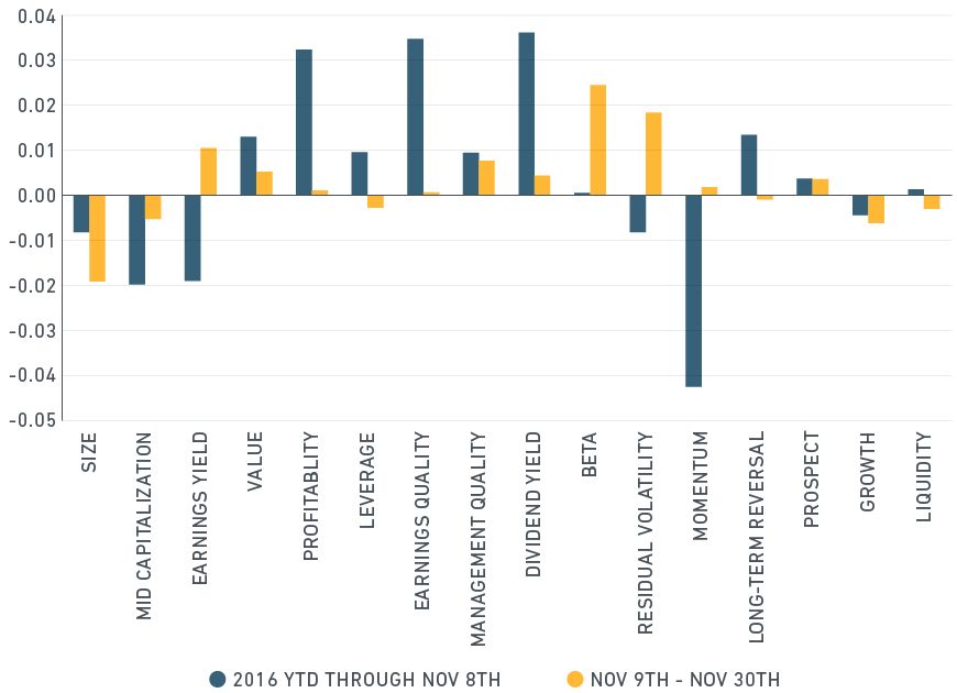 That's not to suggest that the election alone is the only factor that is driving changes in systemic risk. Even before the election, markets had started pricing in a potential interest rate hike and reflected investor sentiment on yield strategies. The recent underperformance of the leverage factor seems to attest to the same concern. If anything, the election may have accelerated the trend.