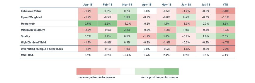 Digging deeper, we found that while the MSCI Quality Index and the MSCI High Dividend Yield Index also underperformed the MSCI USA Index in June, the MSCI Equal Weighted Index (reflecting small size) and the MSCI Minimum Volatility Index outperformed by 0.4% and 1.0%, respectively.