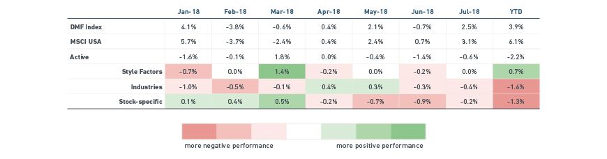 Data from the MSCI Barra® US Total Market Equity Model (Long-Term) investors. July performance is through July 13.