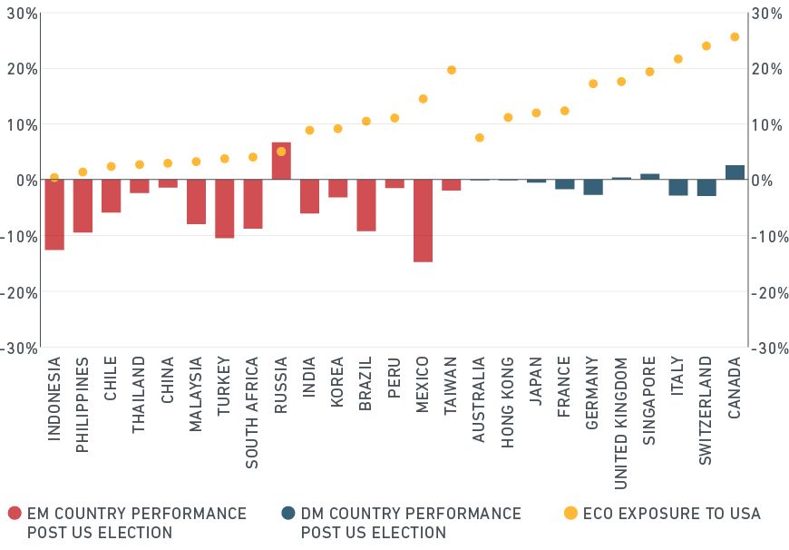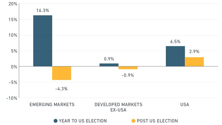Emerging market equities underperformed U.S. stocks by 7.2 percentage points (as of Nov. 30) following Donald Trump's election as president, based partly on the expectation that the president-elect is likely to pursue a series of protectionist policies that could hurt many export-dependent emerging nations. Stocks in developed economies (ex-U.S.) also underperformed those in the U.S., albeit by a smaller margin (3.8 percentage points).
