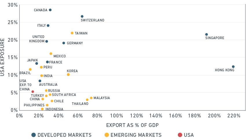 Among emerging markets, Taiwan (19.7%), Mexico (14.5%), Peru (11%) and Brazil (10.5%) depend most heavily on exports to the U.S., while Korea (9.2%) and India (8.9%) also exhibit comparatively high exposures.