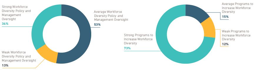 昨年12月時点では、500社のうち半分以下の企業が全5指標を開示しているに過ぎず、1/5は取締役会における女性比率という一つの指標だけしか開示していなかった。また、これらのデータは性別多様性に取り組む企業の努力や意図などは反映していないが、それを反映するものとして、我々は、職場における多様性に関するポリシーの有無、多様性に関する監督を経営者が責任を持つかどうか、女性比率を向上するための目標の有無、女性が働きやすくなるような施策(フレックスタイム制、育児休暇制度など)の有無を調査した。