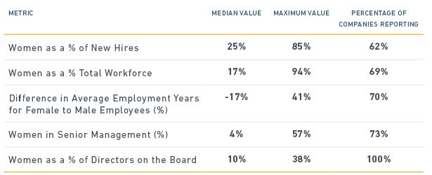 MSCIは、性別多様性に関するイニシアチブと実績が同業種銘柄よりも優れている企業をオーバーウェイトするMSCI日本株女性活躍指数(WIN)を開発した。日本における女性活躍の現状を知るために、我々はMSCIジャパンIMI指数における時価総額上位500銘柄について、女性の採用・継続雇用・昇進を含む5つの指標を調査した(以下Exhibit参照)。